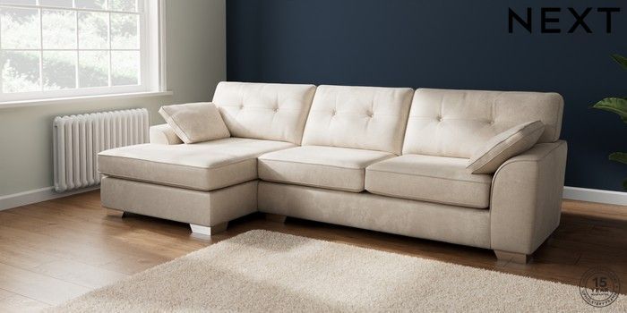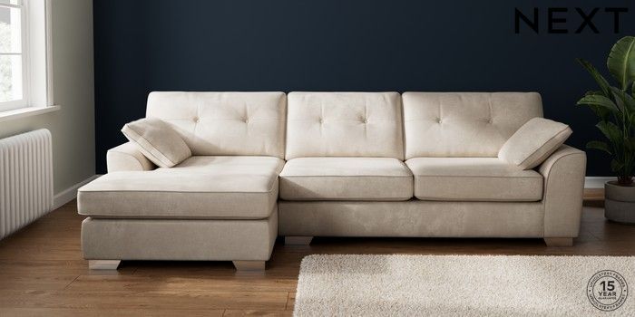 7.2.10 Buy Stamford Buttoned Back Large Sofa Chaise - Left Hand Plush Chenille Oyster Large Square Angle - Chrome Metal from the Next UK online shop Click here to use our accessible website