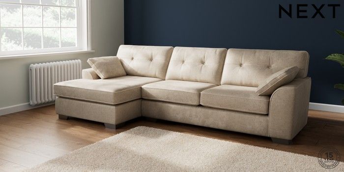 7.2.6 Buy Stamford Buttoned Back Large Sofa Chaise - Left Hand Plush Chenille Light Natural Large Square Angle - Gunmetal from the Next UK online shop Click here to use our accessible website