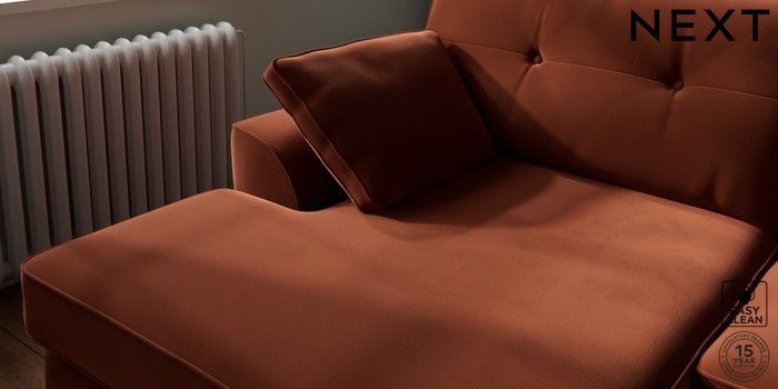 7.2.10 Buy Stamford Buttoned Back Large Sofa Chaise - Left Hand Plush Velvet Easy Clean Ginger Orange Large Square Angle - Gunmetal from the Next UK online shop Click here to use our accessible website