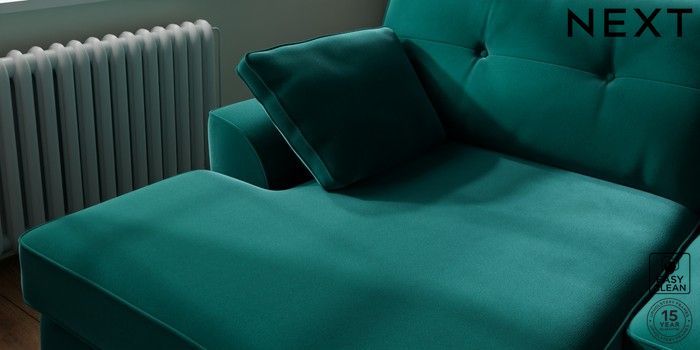 7.2.10 Buy Stamford Buttoned Back Large Sofa Chaise - Left Hand Plush Velvet Easy Clean Juniper Green Large Square Angle - Brushed Brass from the Next UK online shop Click here to use our accessible website