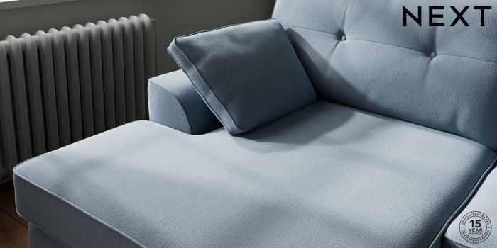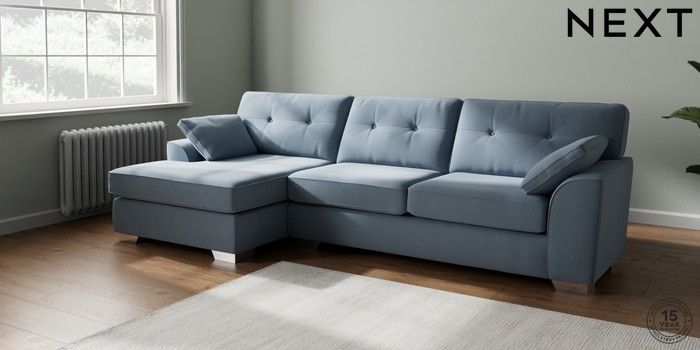 7.2.10 Buy Stamford Buttoned Back Large Sofa Chaise - Left Hand Relaxed Linen Look Mid Blue Large Square Angle - Chrome Metal from the Next UK online shop Click here to use our accessible website