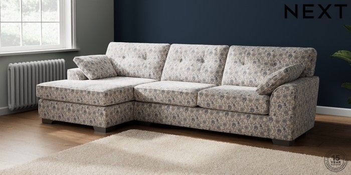 7.3.1 Buy Stamford Buttoned Back Large Sofa Chaise - Left Hand Relaxed Linen Look Print Woodblock Floral Blue Large Square Angle - Gunmetal from the Next UK online shop Click here to use our accessible website