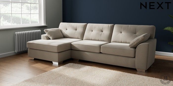 7.2.10 Buy Stamford Buttoned Back Large Sofa Chaise - Left Hand Ripple Chenille Light Natural Large Square Angle - Chrome Metal from the Next UK online shop Click here to use our accessible website