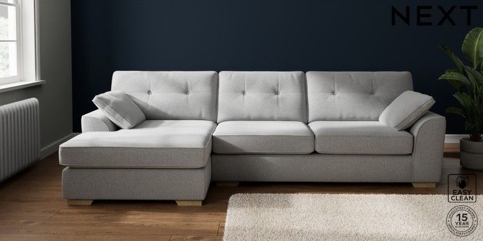 7.2.10 Buy Stamford Buttoned Back Large Sofa Chaise - Left Hand Tweedy Blend Easy Clean Light Silver Grey Large Square Angle - Light from the Next UK online shop Click here to use our accessible website