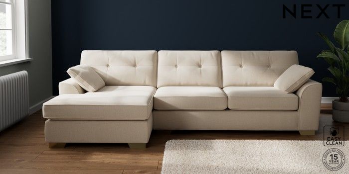 7.2.10 Buy Stamford Buttoned Back Large Sofa Chaise - Left Hand Tweedy Blend Easy Clean Oyster Large Square Angle - Brushed Brass from the Next UK online shop Click here to use our accessible website