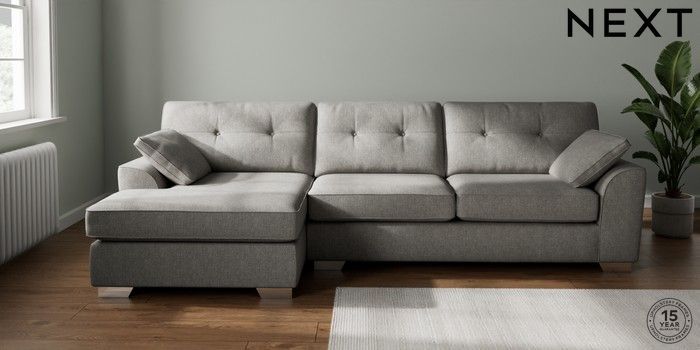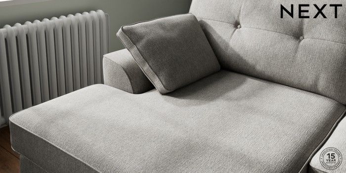 7.2.10 Buy Stamford Buttoned Back Large Sofa Chaise - Left Hand Tweedy Chenille Mid Grey Large Square Angle - Chrome Metal from the Next UK online shop Click here to use our accessible website