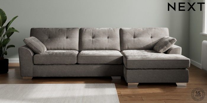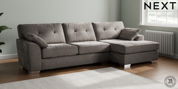 7.2.10 Buy Stamford Buttoned Back Large Sofa Chaise - Right Hand Distressed Velour French Grey Large Square Angle - Chrome Metal from the Next UK online shop Click here to use our accessible website