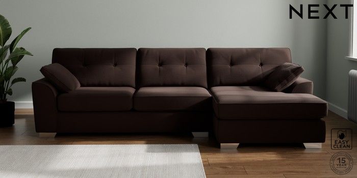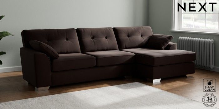 7.2.10 Buy Stamford Buttoned Back Large Sofa Chaise - Right Hand Fine Chenille Easy Clean Chocolate Brown Large Square Angle - Chrome Metal from the Next UK online shop Click here to use our accessible website