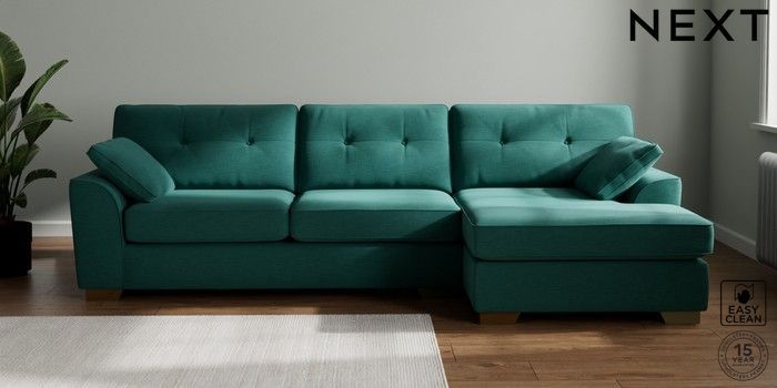 7.2.10 Buy Stamford Buttoned Back Large Sofa Chaise - Right Hand Fine Chenille Easy Clean Dark Juniper Green Large Square Angle - Brushed Brass from the Next UK online shop Click here to use our accessible website