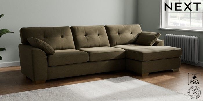 7.2.10 Buy Stamford Buttoned Back Large Sofa Chaise - Right Hand Fine Chenille Easy Clean Dark Moss Green Large Square Angle - Brushed Brass from the Next UK online shop Click here to use our accessible website