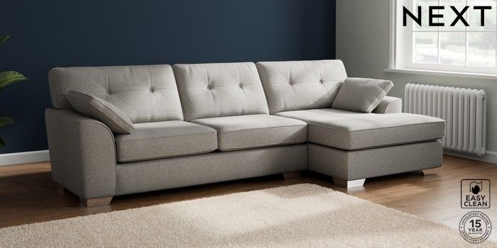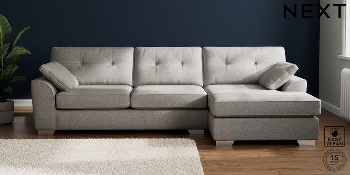 7.2.10 Buy Stamford Buttoned Back Large Sofa Chaise - Right Hand Woven Chenille Easy Clean Light Grey Large Square Angle - Chrome Metal from the Next UK online shop Click here to use our accessible website