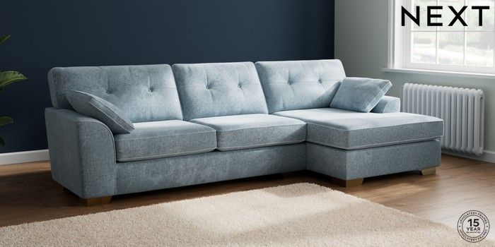 7.2.6 Buy Stamford Buttoned Back Large Sofa Chaise - Right Hand Plush Chenille Light Blue Large Square Angle - Brushed Brass from the Next UK online shop Click here to use our accessible website