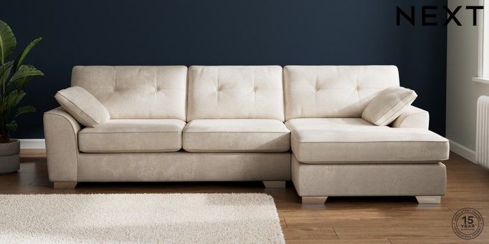 7.2.10 Buy Stamford Buttoned Back Large Sofa Chaise - Right Hand Plush Chenille Oyster Large Square Angle - Chrome Metal from the Next UK online shop Click here to use our accessible website