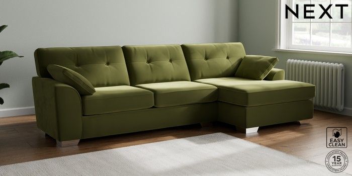 7.3.1 Buy Stamford Buttoned Back Large Sofa Chaise - Right Hand Plush Velvet Easy Clean Mid Olive Green Large Square Angle - Chrome Metal from the Next UK online shop Click here to use our accessible website