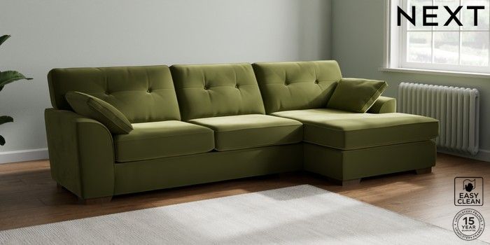 7.2.10 Buy Stamford Buttoned Back Large Sofa Chaise - Right Hand Plush Velvet Easy Clean Mid Olive Green Large Square Angle - Mid from the Next UK online shop Click here to use our accessible website
