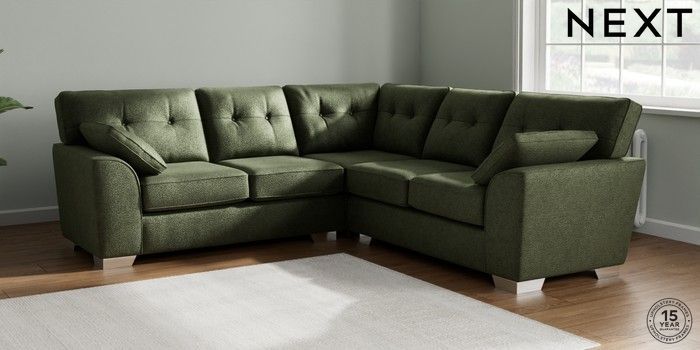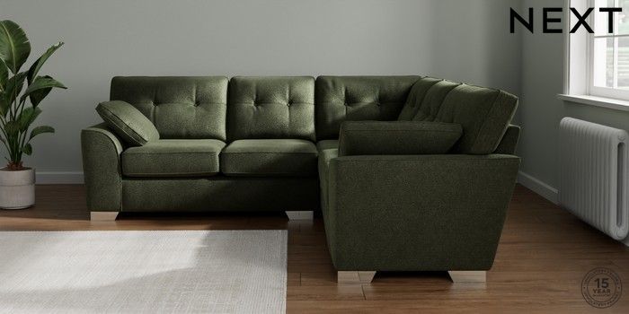 7.2.10 Buy Stamford Buttoned Back Medium Corner Sofa - Universal Boucle Chenille Dark Moss Green Large Square Angle - Chrome Metal from the Next UK online shop Click here to use our accessible website