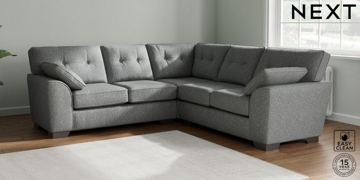7.2.6 Buy Stamford Buttoned Back Medium Corner Sofa - Universal Chunky Boucle Easy Clean Mid Grey Large Square Angle - Gunmetal from the Next UK online shop Click here to use our accessible website