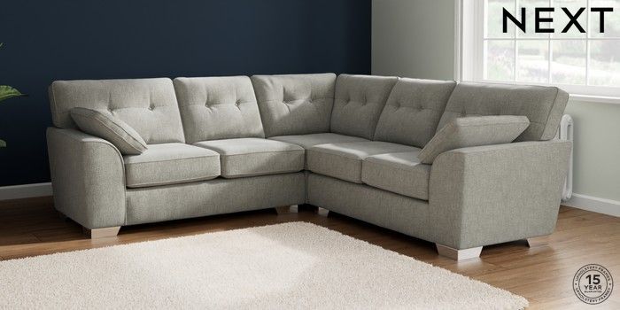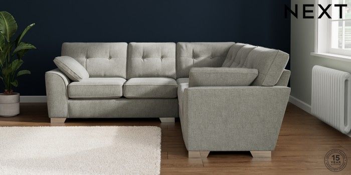 7.2.10 Buy Stamford Buttoned Back Medium Corner Sofa - Universal Chunky Chenille Light Grey Large Square Angle - Chrome Metal from the Next UK online shop Click here to use our accessible website