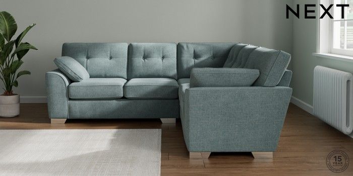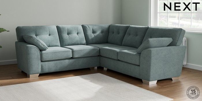 7.2.10 Buy Stamford Buttoned Back Medium Corner Sofa - Universal Chunky Chenille Light Teal Green Large Square Angle - Chrome Metal from the Next UK online shop Click here to use our accessible website