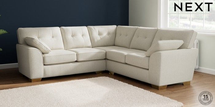 7.2.10 Buy Stamford Buttoned Back Medium Corner Sofa - Universal Chunky Texture Oyster Large Square Angle - Brushed Brass from the Next UK online shop Click here to use our accessible website