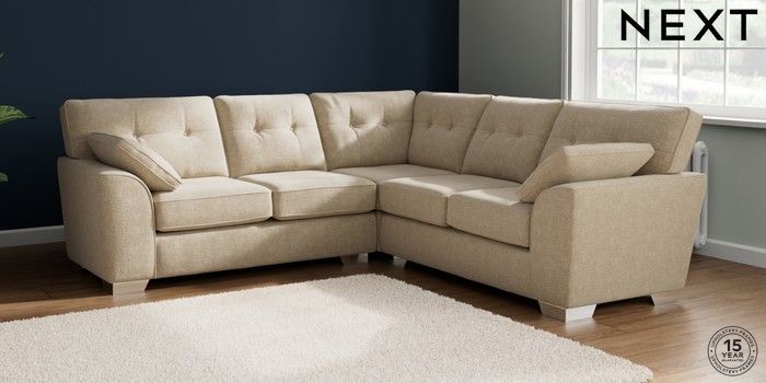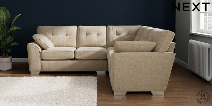 7.2.10 Buy Stamford Buttoned Back Medium Corner Sofa - Universal Chunky Weave Cream Large Square Angle - Chrome Metal from the Next UK online shop Click here to use our accessible website
