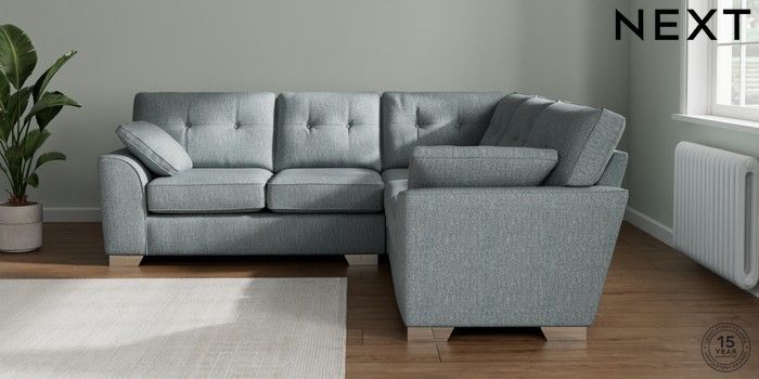 7.2.10 Buy Stamford Buttoned Back Medium Corner Sofa - Universal Chunky Weave Mid Blue Large Square Angle - Chrome Metal from the Next UK online shop Click here to use our accessible website