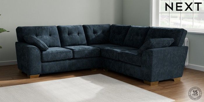 7.2.10 Buy Stamford Buttoned Back Medium Corner Sofa - Universal Distressed Velour Midnight Blue Large Square Angle - Brushed Brass from the Next UK online shop Click here to use our accessible website