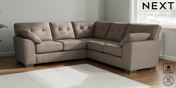 7.2.10 Buy Stamford Buttoned Back Medium Corner Sofa - Universal Fine Chenille Easy Clean Mid Taupe Brown Large Square Angle - Gunmetal from the Next UK online shop Click here to use our accessible website