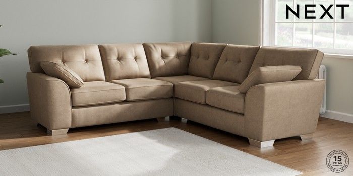 7.2.10 Buy Stamford Buttoned Back Medium Corner Sofa - Universal Luxe Chenille Mid Camel Beige Large Square Angle - Chrome Metal from the Next UK online shop Click here to use our accessible website
