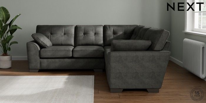 7.2.10 Buy Stamford Buttoned Back Medium Corner Sofa - Universal Monza Faux Leather Easy Clean Dark Grey Large Square Angle - Gunmetal from the Next UK online shop Click here to use our accessible website
