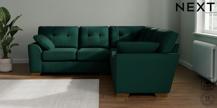 7.2.10 Buy Stamford Buttoned Back Medium Corner Sofa - Universal Plush Velvet Easy Clean Bottle Green Large Square Angle - Brushed Brass from the Next UK online shop Click here to use our accessible website