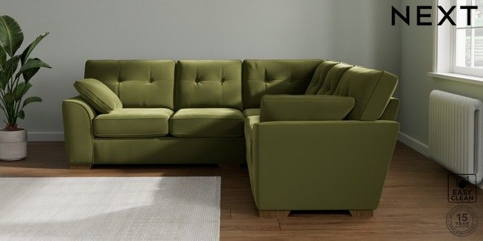 7.2.10 Buy Stamford Buttoned Back Medium Corner Sofa - Universal Plush Velvet Easy Clean Mid Olive Green Large Square Angle - Mid from the Next UK online shop Click here to use our accessible website