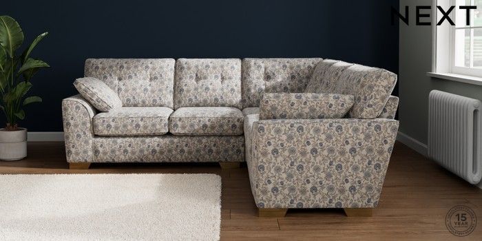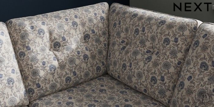 7.3.1 Buy Stamford Buttoned Back Medium Corner Sofa - Universal Relaxed Linen Look Print Woodblock Floral Blue Large Square Angle - Brushed Brass from the Next UK online shop Click here to use our accessible website