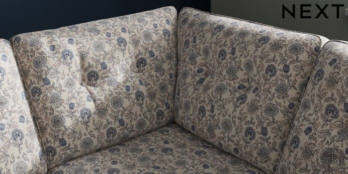 7.3.1 Buy Stamford Buttoned Back Medium Corner Sofa - Universal Relaxed Linen Look Print Woodblock Floral Blue Large Square Angle - Dark from the Next UK online shop Click here to use our accessible website