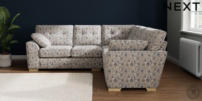 7.3.1 Buy Stamford Buttoned Back Medium Corner Sofa - Universal Relaxed Linen Look Print Woodblock Floral Blue Large Square Angle - Light from the Next UK online shop Click here to use our accessible website