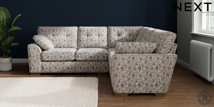 7.3.1 Buy Stamford Buttoned Back Medium Corner Sofa - Universal Relaxed Linen Look Print Woodblock Floral Blue Large Square Angle - Mid from the Next UK online shop Click here to use our accessible website
