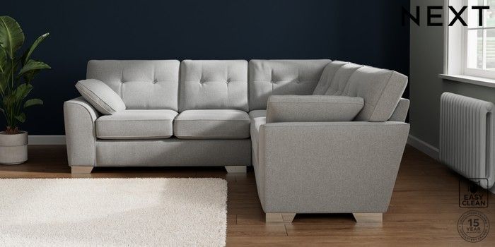 7.2.10 Buy Stamford Buttoned Back Medium Corner Sofa - Universal Tweedy Blend Easy Clean Light Silver Grey Large Square Angle - Chrome Metal from the Next UK online shop Click here to use our accessible website