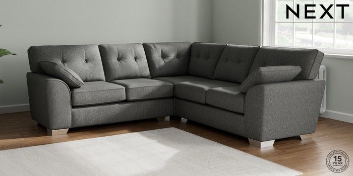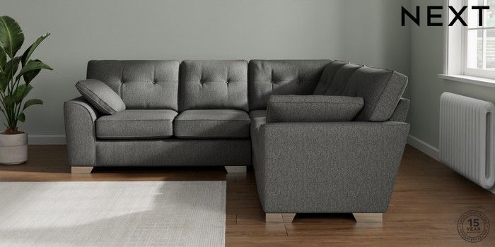7.2.10 Buy Stamford Buttoned Back Medium Corner Sofa - Universal Tweedy Chenille Dark Grey Large Square Angle - Chrome Metal from the Next UK online shop Click here to use our accessible website
