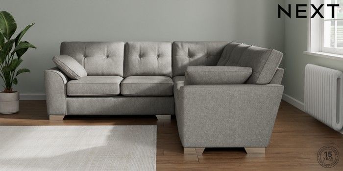 7.2.10 Buy Stamford Buttoned Back Medium Corner Sofa - Universal Tweedy Chenille Mid Grey Large Square Angle - Chrome Metal from the Next UK online shop Click here to use our accessible website