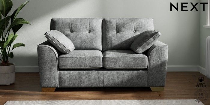 7.2.6 Buy Stamford Buttoned Back 2 Seater Small Sofa Chunky Boucle Easy Clean Mid Grey Large Square Angle - Brushed Brass from the Next UK online shop Click here to use our accessible website