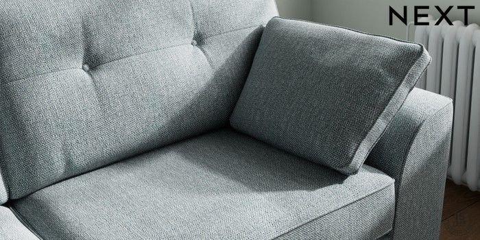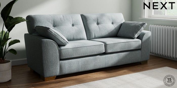 7.2.10 Buy Stamford Buttoned Back 3 Seater Sofa Chunky Weave Mid Blue Large Square Angle - Brushed Brass from the Next UK online shop Click here to use our accessible website