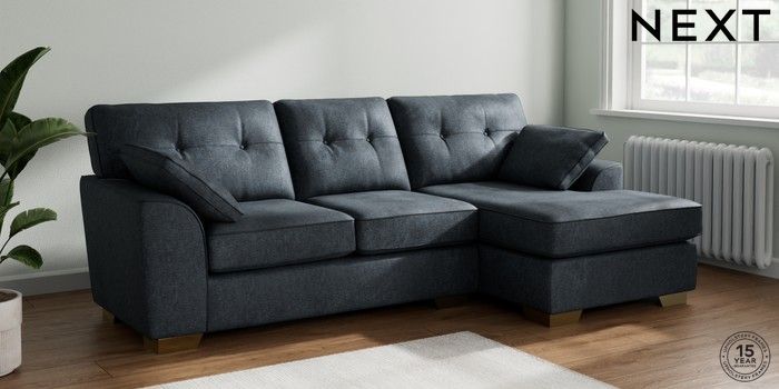 7.2.6 Buy Stamford Buttoned Back Medium Sofa Chaise - Right Hand Plush Chenille Slate Blue Large Square Angle - Brushed Brass from the Next UK online shop Click here to use our accessible website