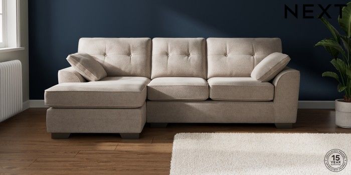 7.2.10 Buy Stamford Buttoned Back Medium Sofa Chaise - Left Hand Boucle Chenille Light Natural Large Square Angle - Gunmetal from the Next UK online shop Click here to use our accessible website