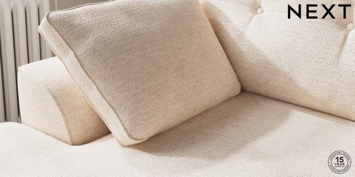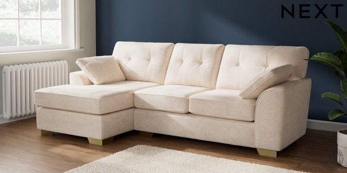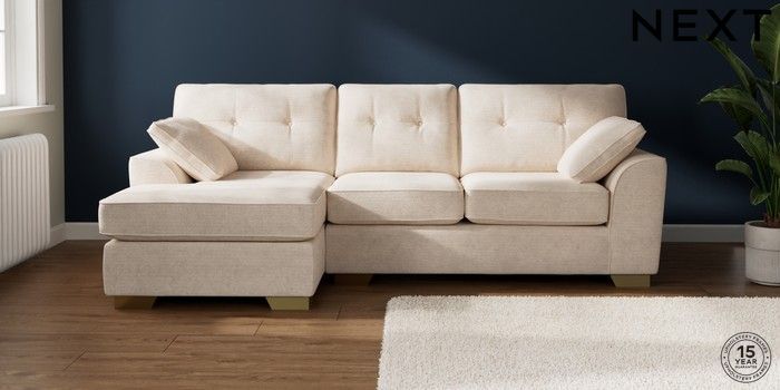7.2.10 Buy Stamford Buttoned Back Medium Sofa Chaise - Left Hand Boucle Chenille Oyster Large Square Angle - Brushed Brass from the Next UK online shop Click here to use our accessible website