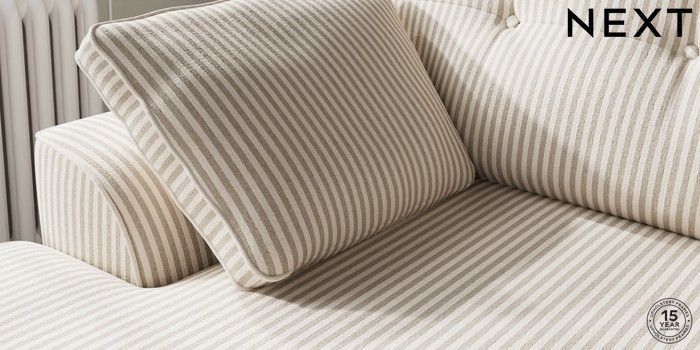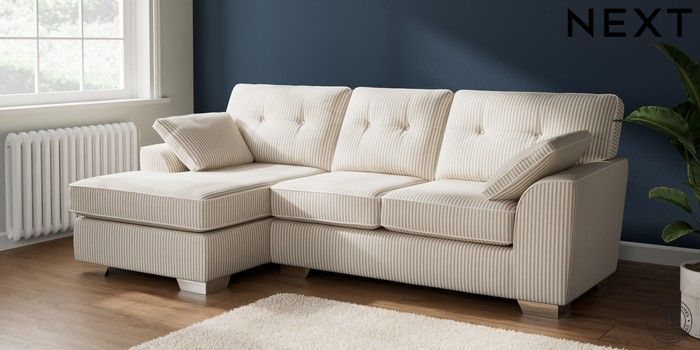 7.3.1 Buy Stamford Buttoned Back Medium Sofa Chaise - Left Hand Chenille Stripe Natural Large Square Angle - Chrome Metal from the Next UK online shop Click here to use our accessible website