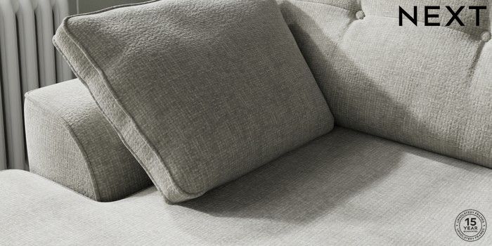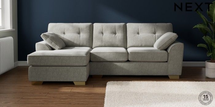 7.2.10 Buy Stamford Buttoned Back Medium Sofa Chaise - Left Hand Chunky Chenille Light Grey Large Square Angle - Brushed Brass from the Next UK online shop Click here to use our accessible website