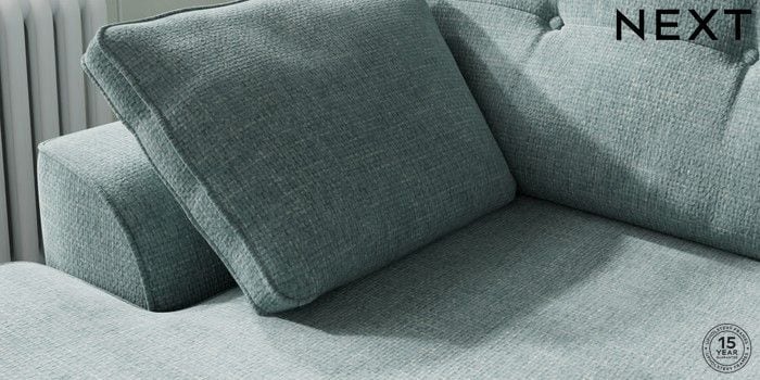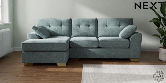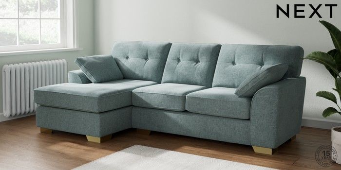 7.2.10 Buy Stamford Buttoned Back Medium Sofa Chaise - Left Hand Chunky Chenille Light Teal Green Large Square Angle - Brushed Brass from the Next UK online shop Click here to use our accessible website