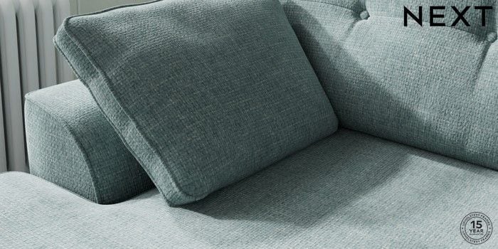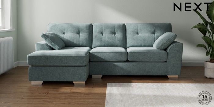 7.2.10 Buy Stamford Buttoned Back Medium Sofa Chaise - Left Hand Chunky Chenille Light Teal Green Large Square Angle - Chrome Metal from the Next UK online shop Click here to use our accessible website