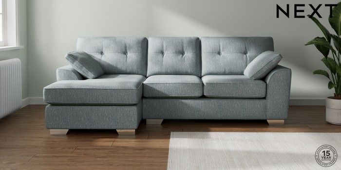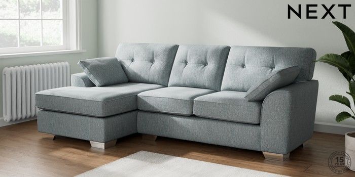 7.2.10 Buy Stamford Buttoned Back Medium Sofa Chaise - Left Hand Chunky Weave Mid Blue Large Square Angle - Chrome Metal from the Next UK online shop Click here to use our accessible website