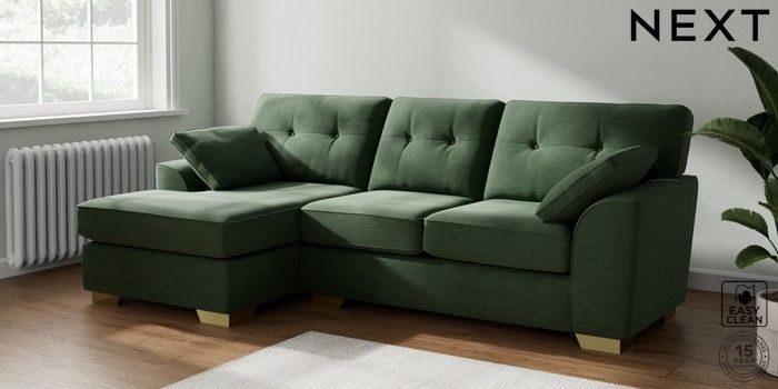 7.2.10 Buy Stamford Buttoned Back Medium Sofa Chaise - Left Hand Fine Chenille Easy Clean Mid Khaki Green Large Square Angle - Brushed Brass from the Next UK online shop Click here to use our accessible website